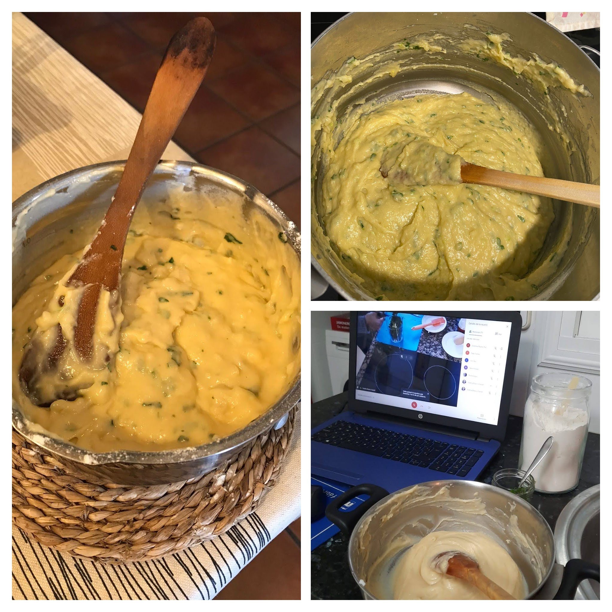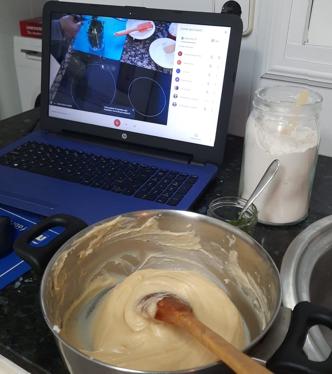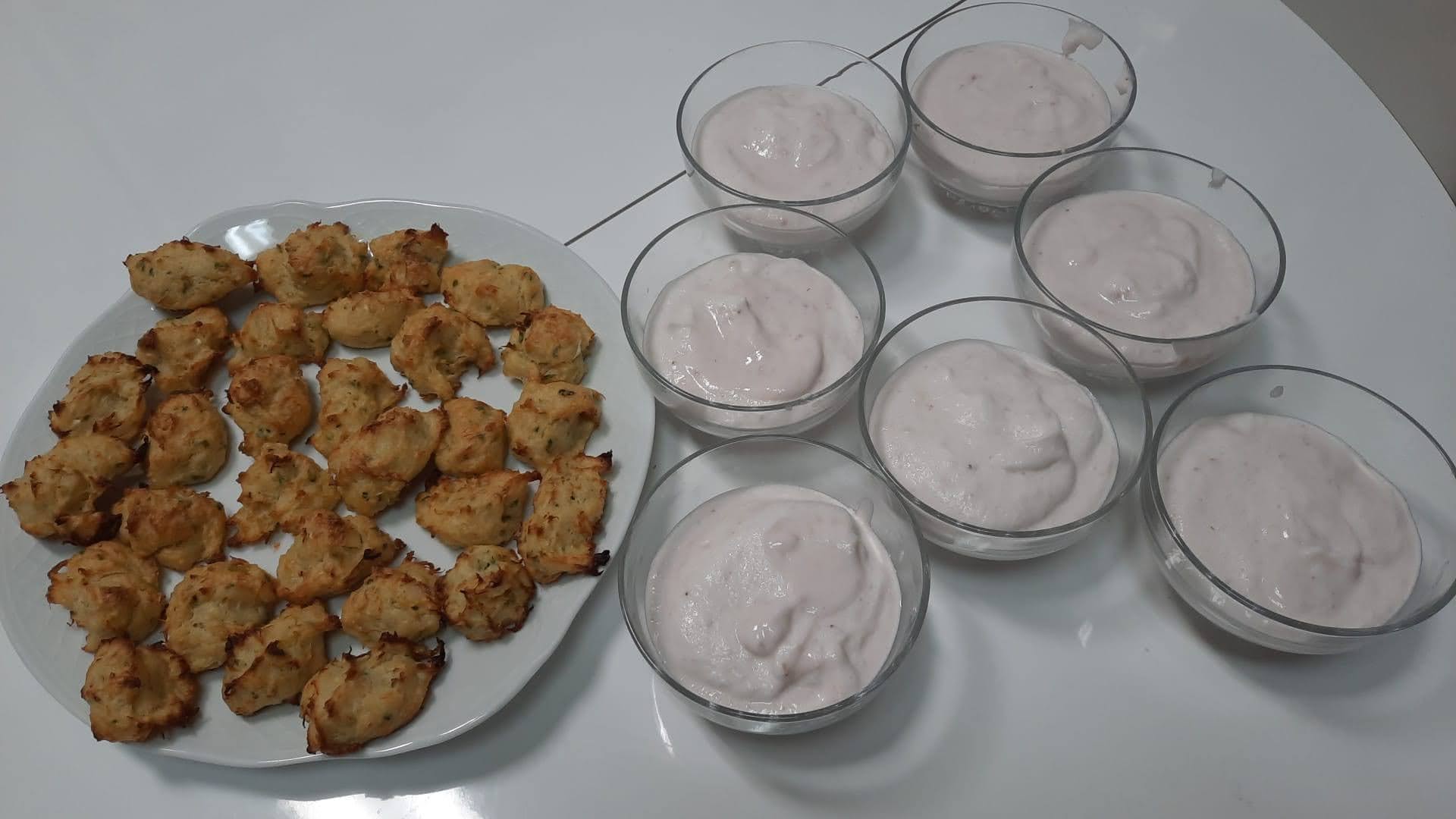 Cuinem Virtual dedicat als bunyols de bacallà cuits al forn; de postres vam fer un semifred de diversos sabors, alguns amb fruita fresca, van triar la maduixa, altre amb confitura de taronja i també vam fer-ne un de torró