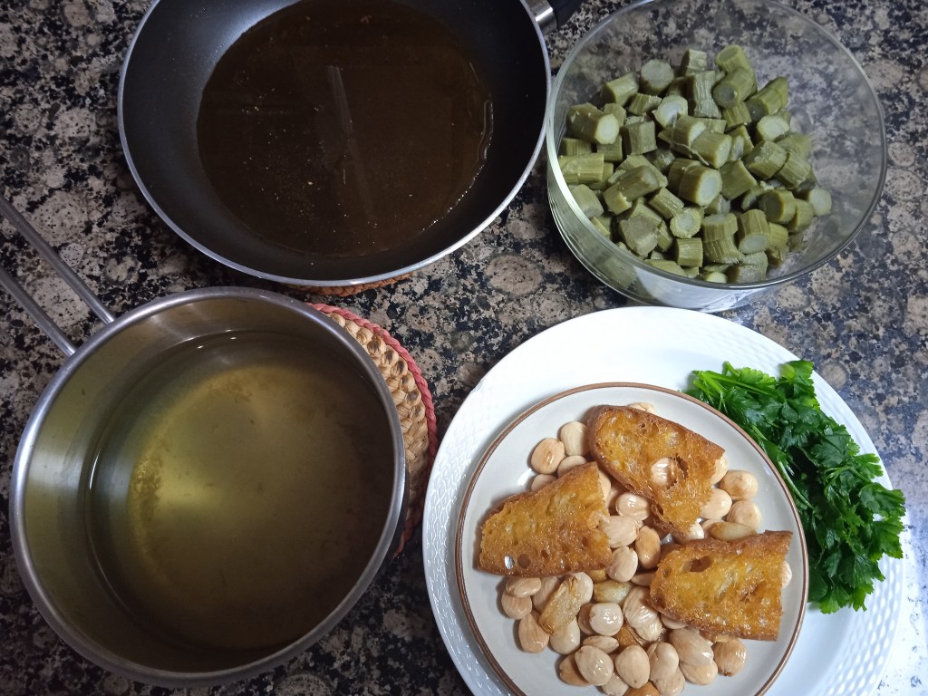 - 400 grams de tonxets prèviament nets i cuits com es mostra a Com netejar i coure els tronxets de carxofa i el brou de bullir-los.